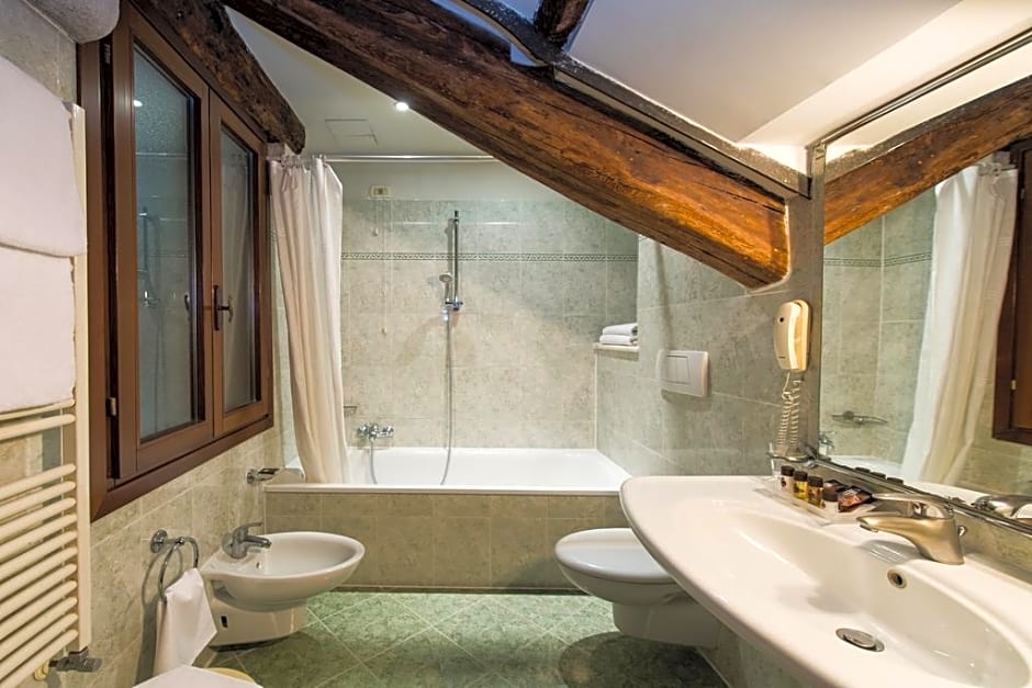 Overlooking the Rio de l'Osmarin canal, this luxurious junior suite offers lovely views of San Giorgio dei Greci church. Its elegant décor features Murano glass chandeliers and exposed wood-beamed ceilings.