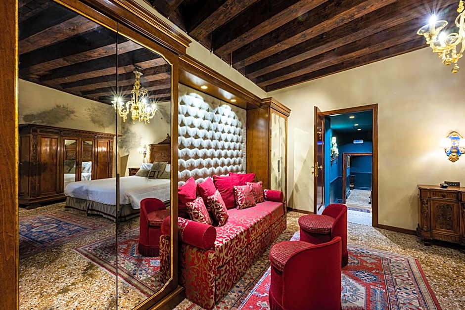 Overlooking the Rio de l'Osmarin canal, this elegant room is decorated with wrought-iron chandeliers and velvet.