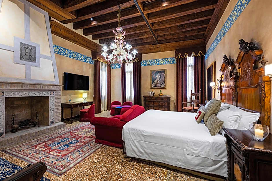 Overlooking the Rio de l'Osmarin canal, this luxurious junior suite offers lovely views of San Giorgio dei Greci church. Its elegant décor features Murano glass chandeliers and exposed wood-beamed ceilings.